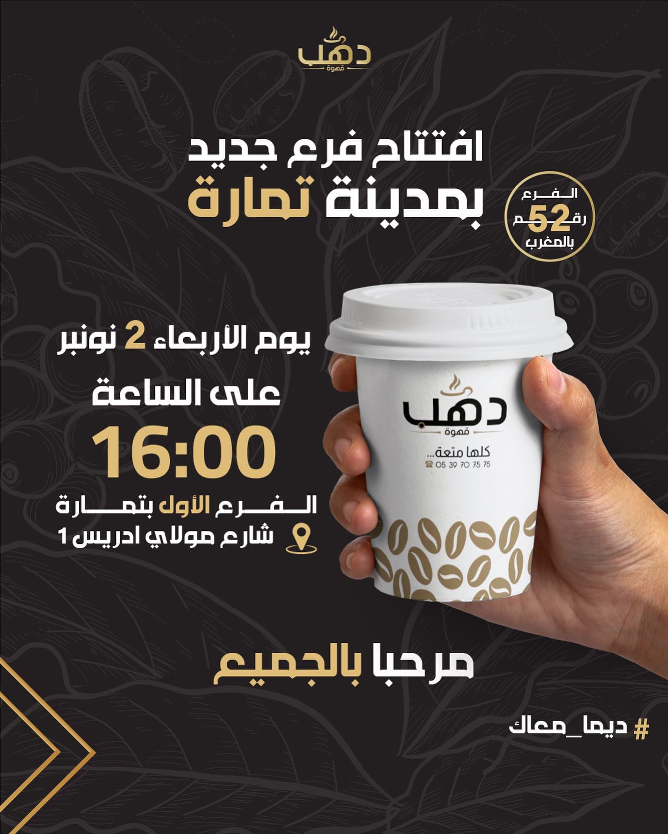 ذهب تفتتح أول فرع لها بمدينة تمارة 31 octobre 2022 2859 Commerce 0 commentaire ينتظر أن تفتتح سلسلة شركة ذهب المتخصصة في تسويق حبوب القهوة فرعا جديدا لها يوم الأربعاء 02 نونبر 2022 بمدينة تمارةالفرع الجديد، سيحط الرحال بشارع مولاي ادريس الأول بالمسيرة1، و هو الفرع رقم 50 في سلسلة فروع هذه الشركة الرائدة في مجال القهوةذهب تحط الرحال بشارع مولاي ادريس بالمسيرة 1 – تمارةو لا يقتصر نشاط شركة ذهب على تسويق منتجات القهوة فقط، بل تعمل على تنويع منتوجاتها من قبيل الشاي و العسل و مواد استهلاكية أخرى