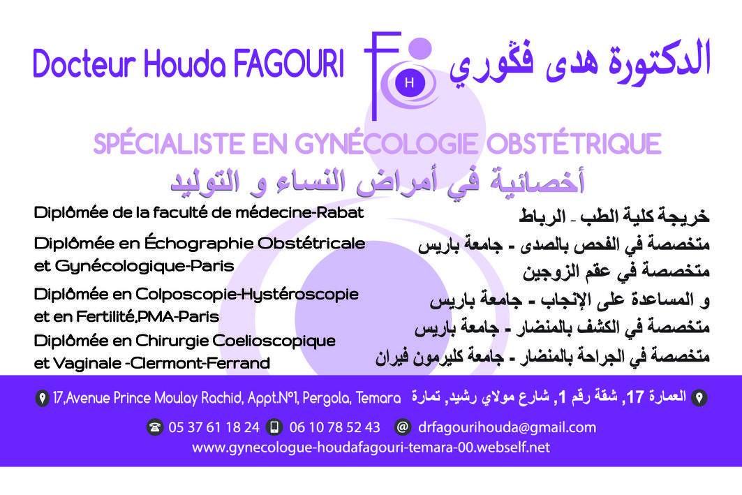Le Docteur Houda Fagouri vous accueille dans son agréable cabinet médical spécialisé en gynécologie-obstétrique situé au centre de Temara.